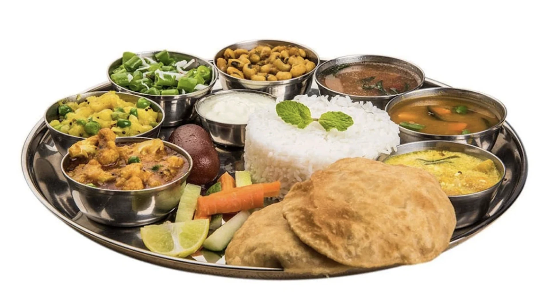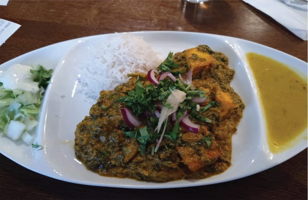 Vegetarisk samosa med myntasås, palak paneer, husets daal och vegetarisk gryta. Serveras med stekt saffransris och vitlöksnaan.