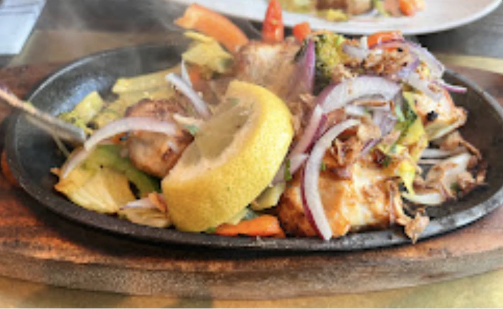 Tre olika kryddmarinerade och grillade kyckling- bröstfiléer (Tandoori, Vitlök, Chili) serveras med stekt lök, paprika och säsongens blandade grönsaker på ett hett järnfat, severas sedan med en krämig, mild tikka masalasås gjord på tomat, yoghurt och cashewnötter.
