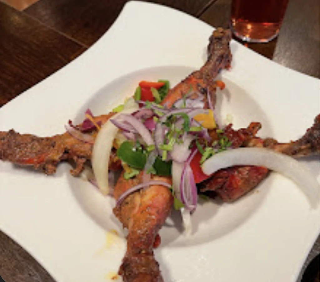 Tandoorimarinerade och grillade kycklingklubbor tillagade med stekt lök, paprika, örtkryddor, garam masala och en tomat–cashewnötsblandning i smakrik grönsaksbuljong. Serveras på ett hett järnfat med hemgjord chili–mango-pickles.
