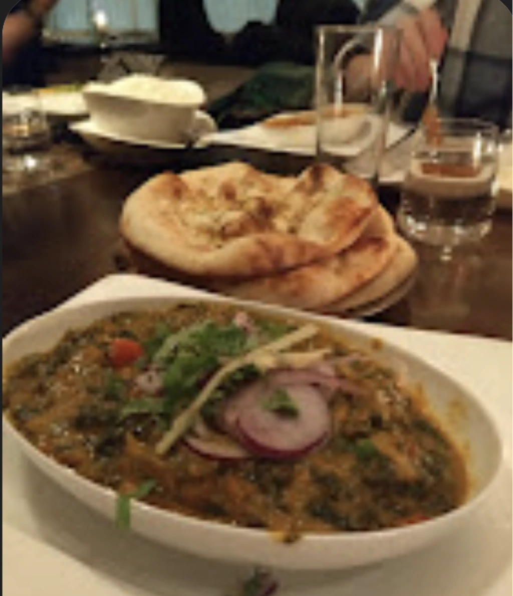 Smörstekt och rostad vitlöksgryta med spenat, stekt lök, paprika, tomat, friterad lök, ingefära, färsk koriander och garam masala, tillagad i en tomat- och cashewnötsblandning med grönsaksbuljong och currysås.